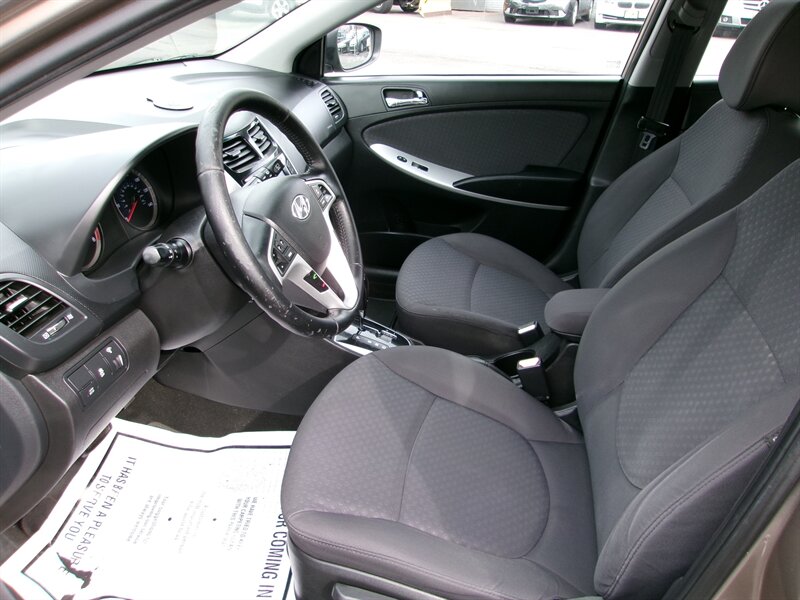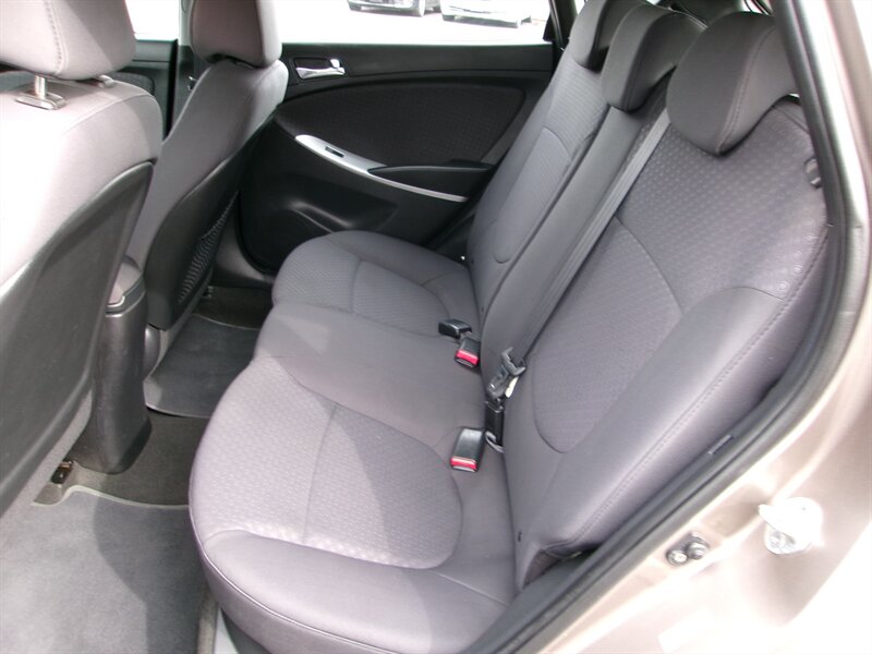 2012 Hyundai Accent SE in gray with a gray cloth interior, powered by a 1.6L I4 engine producing 138 hp and 123 ft-lbs of torque. Factory equipment includes air conditioning, power windows and door locks, remote keyless entry, cruise control and tilt steering, cloth seats with split-folding rear bench, an AM/FM/CD/aux audio system with steering-wheel audio controls, and 15-inch wheels. This vehicle is in excellent overall condition.