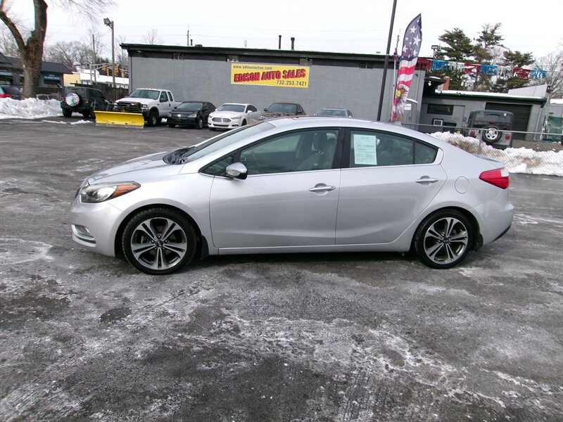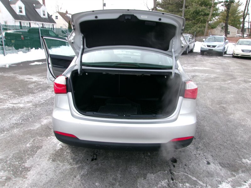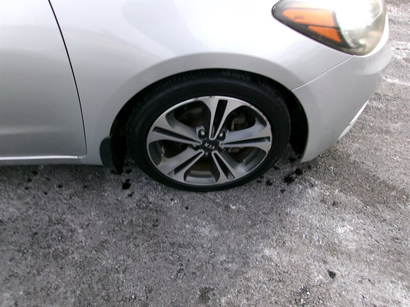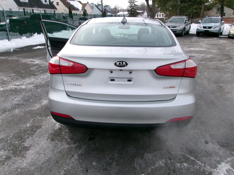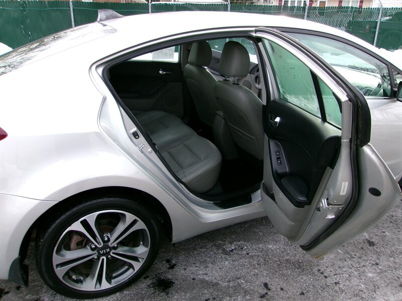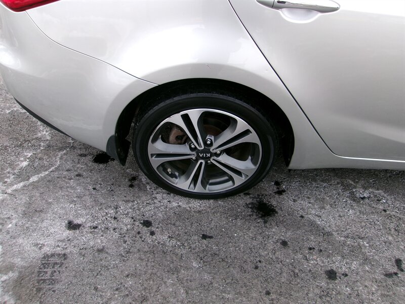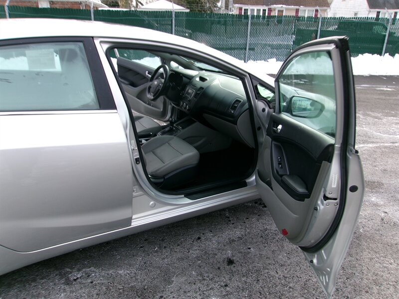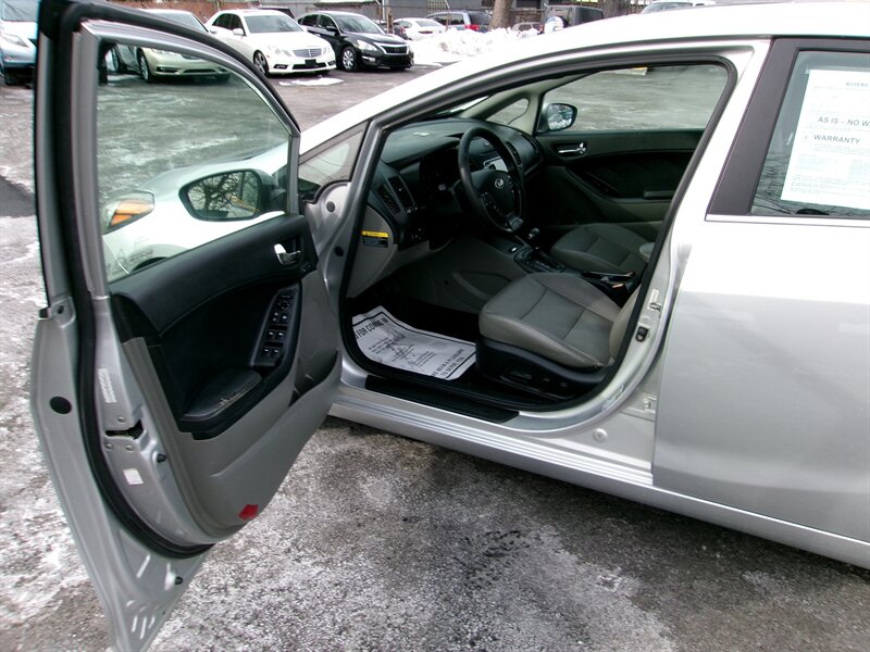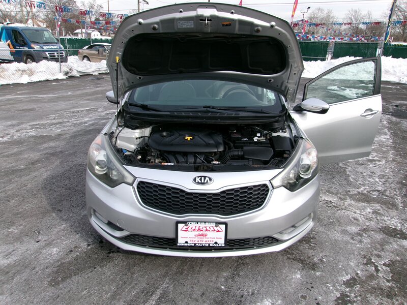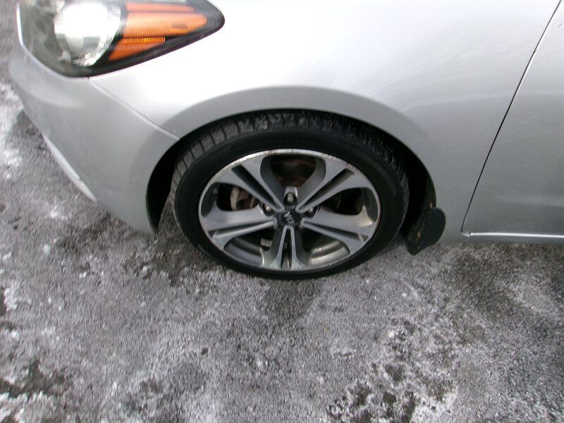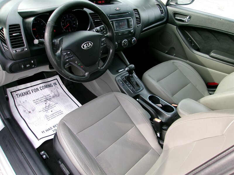 2015 Kia Forte EX in Bright Silver with a Black interior, in excellent overall condition. Powered by the factory 2.0L I4 producing 173 hp and 154 lb-ft of torque. Factory-equipped features include alloy wheels, power windows and locks, remote keyless entry, heated power mirrors, air conditioning, cruise control, tilt-and-telescoping steering wheel, steering-wheel audio and phone controls, Bluetooth hands-free connectivity, USB/AUX inputs and AM/FM/CD audio with multiple speakers, leatherette seating surfaces with heated front seats and a power sunroof.