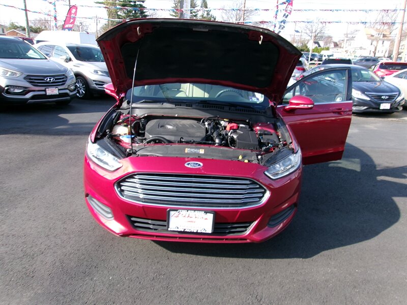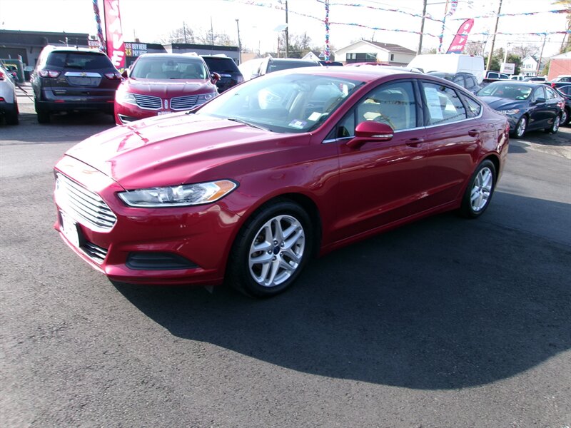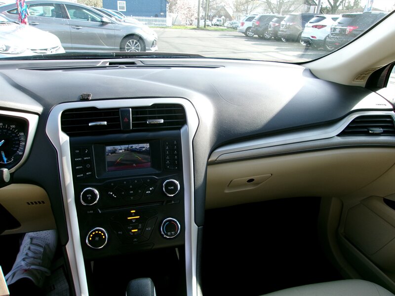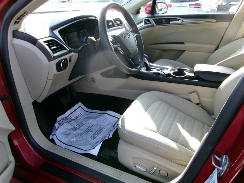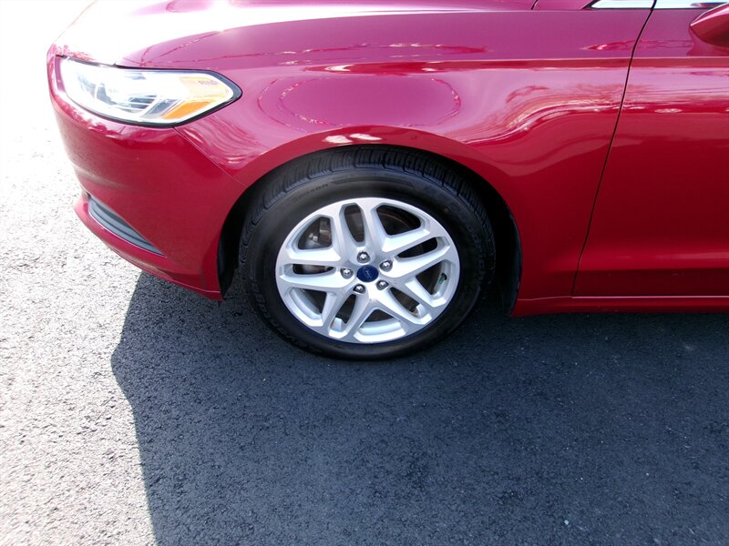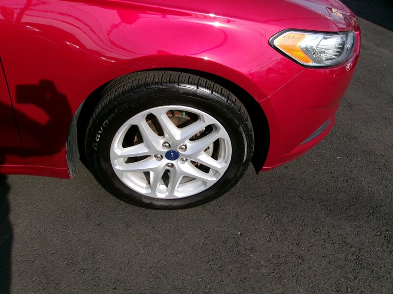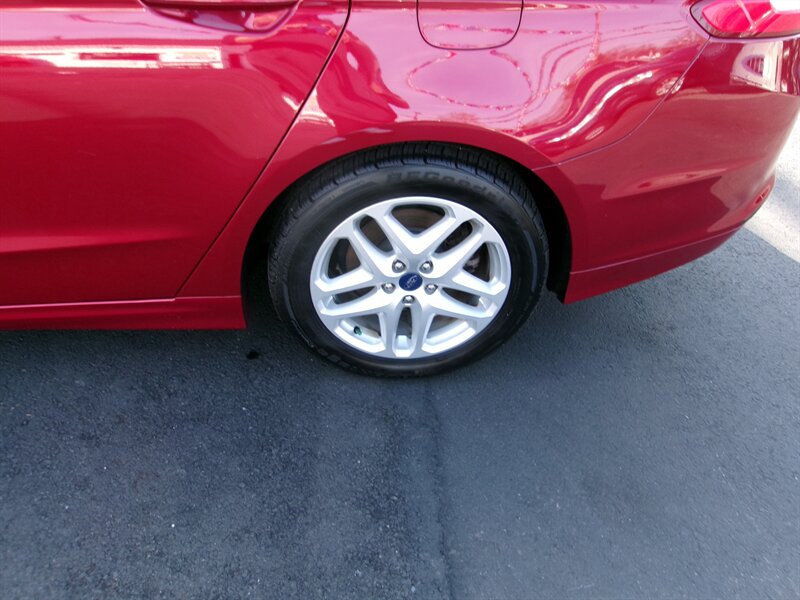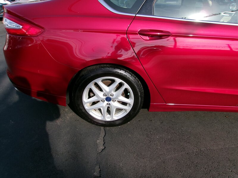 2016 Ford Fusion SE is powered by a 1.5L EcoBoost turbocharged I4 (181 hp, 185 lb-ft) mated to a 6-speed automatic and front-wheel drive. Factory equipment includes alloy wheels, halogen headlamps, power windows/locks/mirrors, remote keyless entry, cruise control, steering-wheel-mounted audio and phone controls, Ford SYNC with Bluetooth, USB and auxiliary inputs, AM/FM/CD audio, comfortable Ebony cloth seating with 60/40 split-fold rear seat, air conditioning. Vehicle is in excellent overall condition.