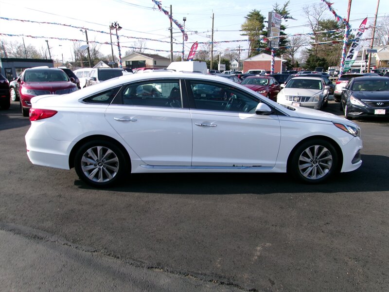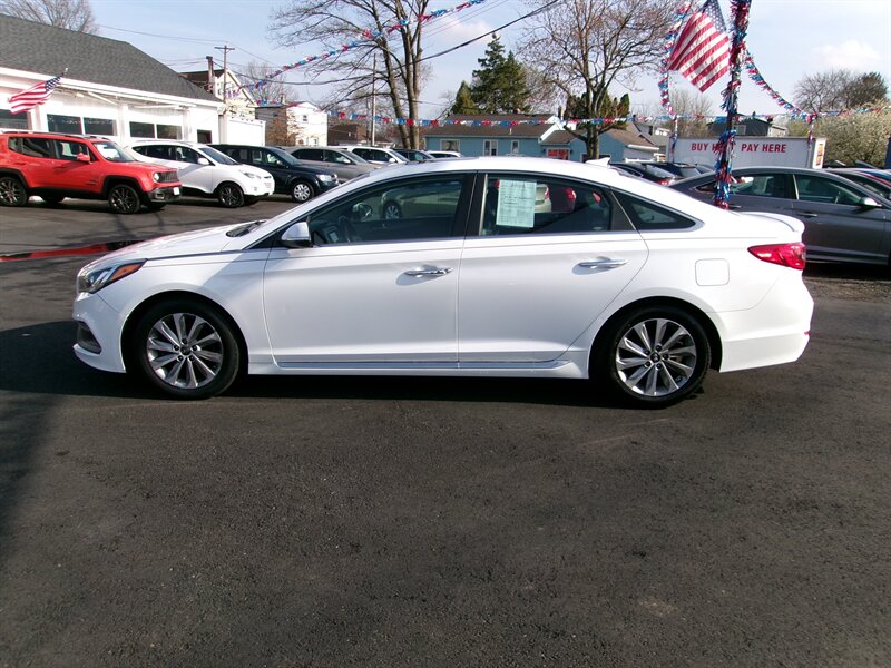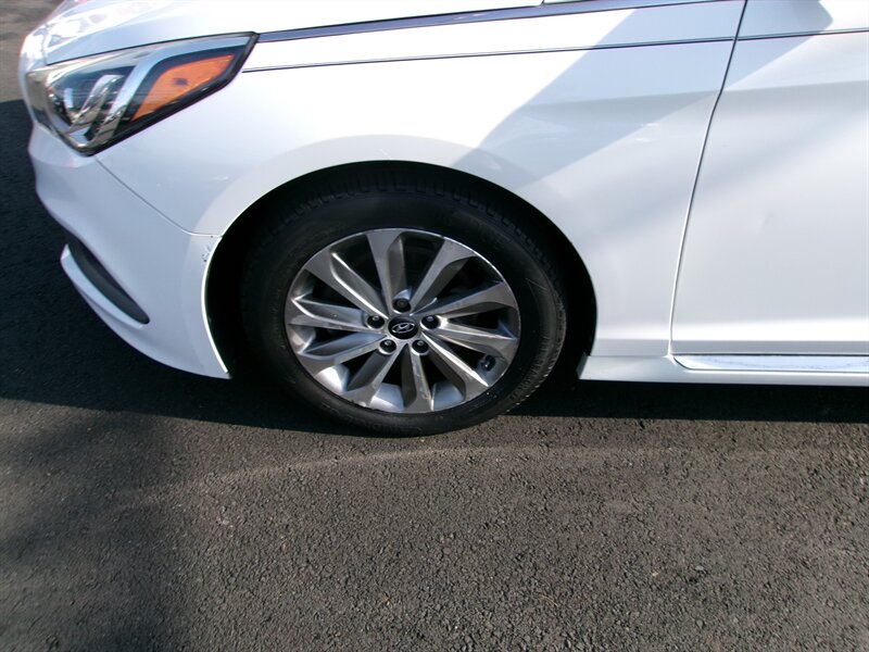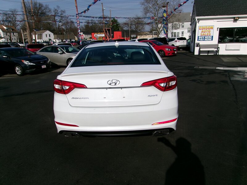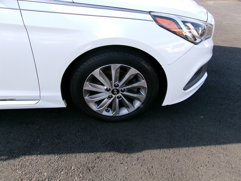 2017 Hyundai Sonata Sport in white with a black interior, powered by the factory 2.4L I4 engine (185 hp, 178 lb-ft) paired with a 6-speed automatic and front-wheel drive. Factory-default equipment includes sport exterior styling elements (18-inch alloy wheels, rear lip spoiler, dual chrome exhaust tips and fog lamps) and a sport-tuned suspension. Interior features include black trim, a center touchscreen infotainment system with AM/FM, USB/AUX and Bluetooth audio/phone connectivity, steering-wheel-mounted audio and cruise controls, dual-zone automatic climate control, and power windows/locks/mirrors. This vehicle is in excellent overall condition.